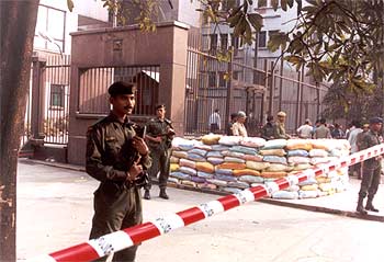 The USIS in Kolkata turned into a virtual fortress after four motorcyle-borne terrorists shot dead four policemen and injured several others early on Tuesday. Three groups have claimed responsibility for the attack so far : The Bangladesh-based Harkat-ul-Jehadi-Islami, the little-known Asif Rezak Commando and the Dubai-based mafia don Farhan alias Aftab Malik.