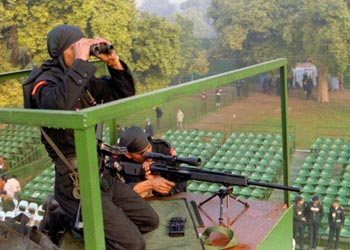 A sniper team of the National Security Guard (NSG) keeps vigil during the full dress rehearsal of the Republic Day parade on January 23. Security for the actual event, which was scaled down owing to the massive deployment on the Pakistan border, was at unprecedented high.