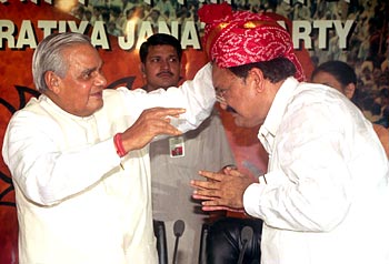 Prime Minister Atal Bihari Vajpayee ties a turban on the newly inducted BJP president Venkaiah Naidu at the party headquarters in New Delhi on Monday, July 1.