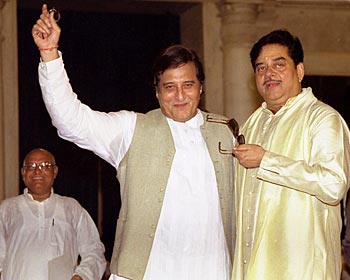 Actors turned Bharatiya Janata Party Members of Parliament Vinod Khanna and Shatrughan Sinha strike a pose after being sworn in as Cabinet ministers at Rashtrapati Bhavan in New Delhi on Monday, July 1.