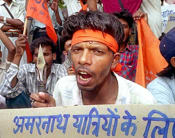 Bajrang Dal activists demonstrate in New Delhi on July 9 against the J&K government's decision to impose a special road tax on buses and a personal registration fee of Rs 25 for pilgrims traveling to the Amarnath shrine. The taxes were later revoked.