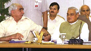 Prime Minister Atal Behari Vajpayee with Finance Minister Jaswant Singh during a meeting with leading industrialists in New Delhi on Wednesday, July 10, 2002.