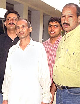 Former Indian Air Force employee Naresh Kumar Dagar (in white shirt) who was arrested for passing sensitive information to a Pakistan High Commission staffer Aamir Sabir, with Delhi police special branch officials in New Delhi on Saturday, June 1.