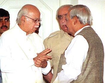Home Minister L K Advani and External Affairs Minister Jaswant Singh confer with Prime Minister Atal Bihari Vajpayee at the Indira Gandhi international airport on June 2, minutes before the latter left for Almaty, Kazakhstan, to attend an Asian security conference.