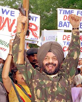 All India Anti-terrorist Front Chairman MS Bitta shouts anti-Pakistan slogans while brandishing a rifle during a demonstration in New Delhi on Wednesday, June 5.