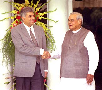 Sri Lankan Prime Minister Ranil Wickremesinghe with Prime Minister Atal Bihari Vajpayee in New Delhi on Tuesday, June 11, 2002.