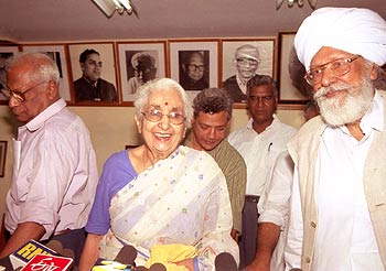 Colonel Laxmi Sehgal, the presidential nominee of the Left, with Harkishen Singh Surjeet (left), A B Bardhan (right) and Sitaram Yechuri (behind) on her way to address a press conference in New Delhi on Monday, June 17.