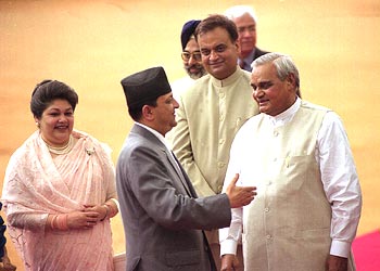 Nepal's King Gyanendra Bikram Shah and Queen Komal meet Prime Minister Atal Behari Vajpayee in the forecourt of Rashtrapati Bhawan in New Delhi on Monday, June 24. The King's six-day state visit was his first official trip abroad after ascending the throne