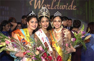 Miss India-South Africa Sarika Sukdeo is flanked by 2nd runner up Miss India-Tanzania Ekta Bhatt and 1st runner up Miss India-Trinidad Tricia Bhim. Photograph: Mohammed Jaffer/SnapsIndia |