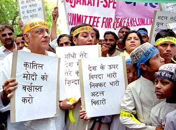 Film-maker Mahesh Bhatt and actress-MP Shabana Azmi at a rally in New Delhi on April 30 to protest against the continuing communal violence in Gujarat.