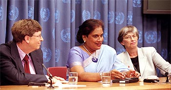 Microsoft founder Bill Gates, President Chandrika Kumaratunga of Sri Lanka and UNICEF Executive Director Carol Bellamy at a press conference on the Global Alliance for Improved Nutrition at the UN on Thursday, May 9.