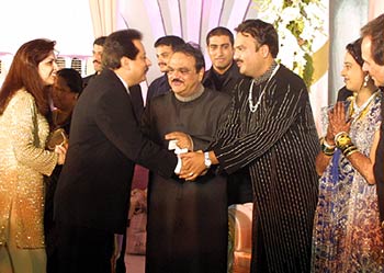 Singer Pankaj Udhas, accompanied by wife Farida and brother Manhar (right) greet the couple. The event was recorded by cameras posted at various locations including one on a crane! That proved invaluable when Laloo Yadav decided to do a walkabout among the 'people.' Laloo was mobbed, but seemed none the worse for it... Back Next |