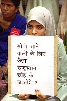 Activists of several women's organisations on a dharna in New Delhi on Monday, May 13, demanding a special relief package for the riot affected women of Gujarat.