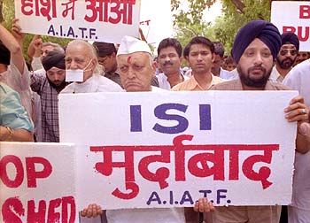 Activists of All India Anti-Terrorist Front protest near the Pakistan High Commission in New Delhi, May 15, against the Pakistan-backed terrorist attack on bus passengers and an army camp near Jammu.