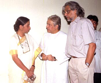 Sarod master Amjad Ali Khan and filmmaker Muzaffar Ali with Shabana Azmi at a prayer meeting for poet and Shabana's father Kaifi Azmi in New Delhi on Tuesday, May 14.