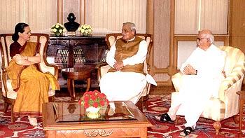 Prime Minister A B Vajpayee, Home Minister L K Advani and Leader of the Opposition Sonia Gandhi discussing on Sunday, May 19, possible action against Pakistan as well as candidates for the presidential election next month.