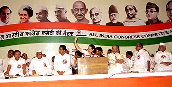 Congress president Sonia Gandhi waves to delegates at the All-India Congress Committee session in New Delhi on Friday, May 24.