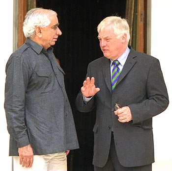 Chris Patten (right), European Union commissioner for foreign relations, makes a point to External Affairs Minister Jaswant Singh in New Delhi on May 24.