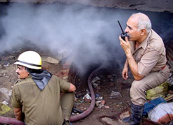 A Delhi Fire Brigade officer co-ordinates efforts to extinguish a fire in a slum cluster near Lodhi Hotel in south Delhi on Sunday, May 26.