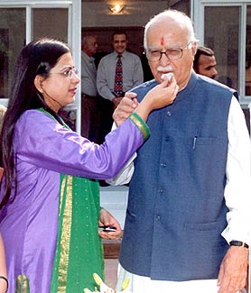 Deputy Prime Minister Lal Kishenchand Advani is fed sweets by his daughter, Pratibha, on his 75th birthday in New Delhi on Friday, November 8.