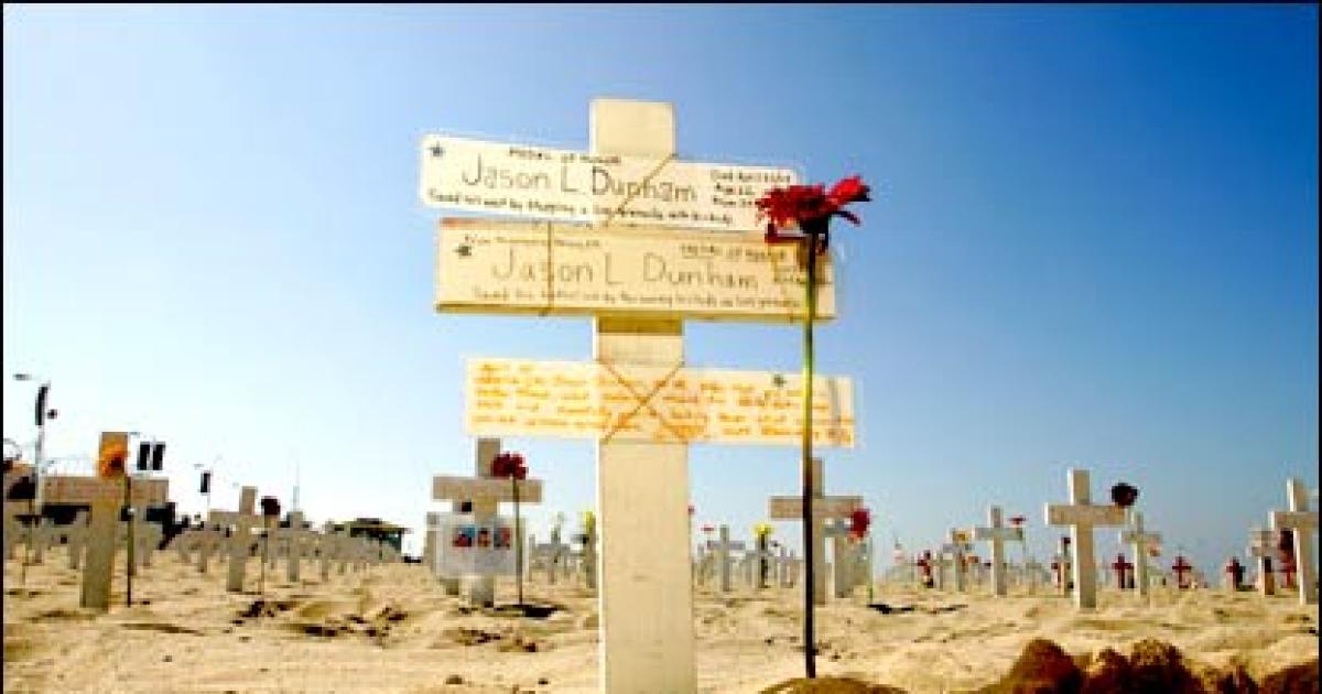 Crosses that commemorate the over 1,000 American military deaths in Iraq sit in the sand on the beach in Santa Monica, California.