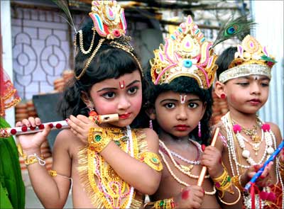 Children, like these tots in Agartala, are often dressed as Lord Krishna on Janmashtami