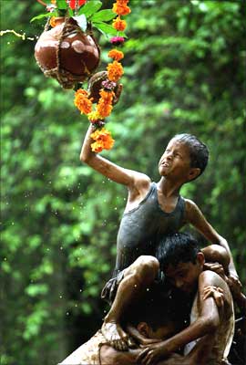 Several devotees partake in this celebration, during which a large earthenware pot is filled with milk, curds, butter, honey and fruits and is suspended from a height of between 20 to 40 feet.