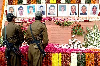 Image: Armed commandoes on duty at Parliament House pay tributes to victims to mark the fifth anniversary of terrorist attack on Parliament House in New Delhi on Wednesday, December 13, 2006.