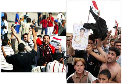 Image: Iraqi men celebrate the guilty verdict against former Iraqi dictator Saddam Hussein November 5, 2006 in the Shiite Sadr city neighborhood of Baghdad, Iraq. In his hometown of Tikrit, however, people protest the sentence.
