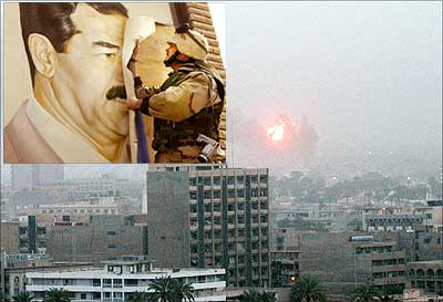 Image: (Inset) A US Marine pulls down a poster of Iraqi President Saddam Hussein in Safwan, Iraq. (Right) An explosion in Baghdad on March 20, 2003, as the US invaded Iraq