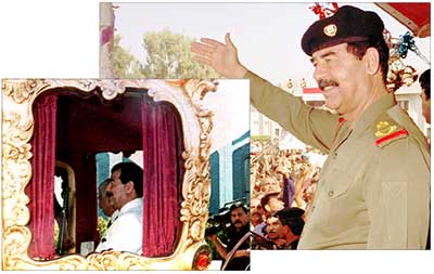 Images: (Left) Saddam Hussein sits in a carriage coach on his 56th birthday. Saddam waves to his supporters in a rare public appearance in Baghdad.
