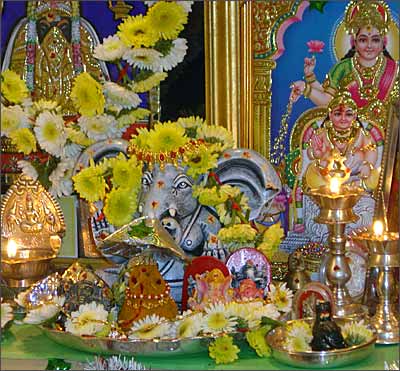 She says: My husband, Ravi makes the Ganesha every year. He made him from haldi (turmeric). In this photograph the tiny yellow Ganesha is the one we made. The rest are from our collection.