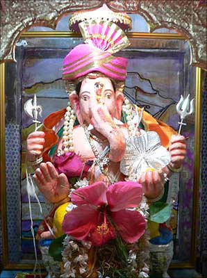 The room where Ganesha is kept is also decorated with a variety of patakas (square pieces of paper cut in various designs and pasted on a string).