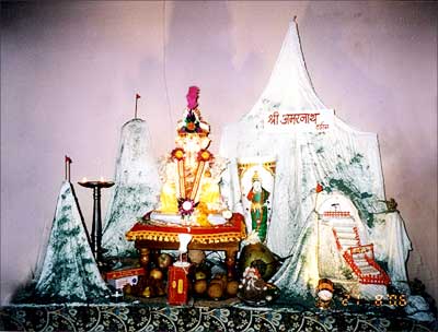 The background for this Ganesha is similar to the Amarnath darshan. More features on Ganesh Puja: Ganeshotsav home Back | Next