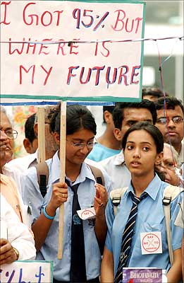 Image: Indian school children join the anti-reservation protest at AIIMS in May last year. At one point, there were 15,000 protestors on the campus each day.