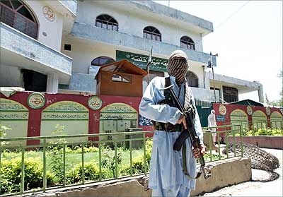 Photograph: A Pakistani radical stands in front of the Lal Masjid during a clash with paramilitary troops in Islamabad. Pakistani security forces finally stormed and took control of the pro-Taliban mosque after a fierce battle that left more than 90 people dead. Photograph: Aamir Qureshi/AFP/Getty Images