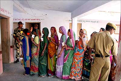 Image: Women display their voters identity cards as they wait in line to cast their ballots at a polling centre in Ankewadia village, some 100 km from Ahmedabad, on Tuesday.