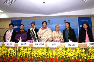 Day 2 of the Pravasi Bharatiya Divas 2007 saw several working sessions including one for women. The panelists at the session were (from left) MP Prema Cariappa, National Commission for Women Chairperson Girija Vyas, Central Social Welfare Board Chairperson Rajani Patil, Minister of State of Women and Child Development Renuka Choudhury, Thermax chief Anu Aga, MP Brinda Karat and Sushmita Ghosh.