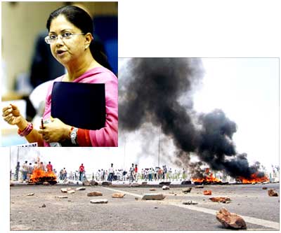 Image: Protestors on the blocked Jaipur-Ajmer highway. (Inset) Rajasthan Chief Minister Vasundhara Raje Scindia.