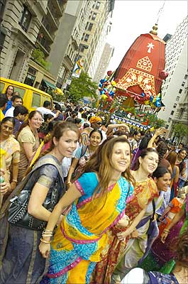 Mama, why are these men and women dancing in the streets," a young girl asked her mother as the annual Hare Krishna Ratha Yatra was winding its way down New York's Fifth avenue. "They are Hindus, they are like us," the mother said. "They are showing their devotion to Lord Krishna. Dancing and singing is one way to show others that religion gives us happiness."