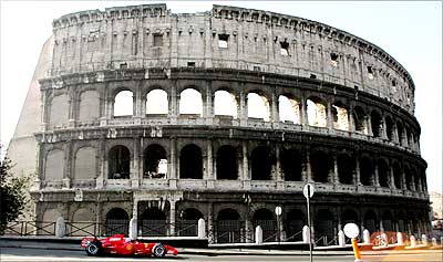 Image: A Formula One Ferrari cruises past the Coliseum. Photograph: Andreas Solaro/AFP/Getty Images