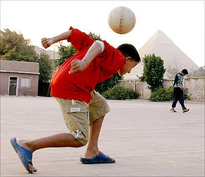 Image: An Egyptian boy plays football close to the Pyramids in Giza, south of Cairo. Photograph: Khaled Desouki/AFP/Getty Images