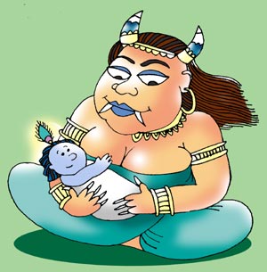 Since she did not know which child was Devaki's, she began killing all the newborn babies in town by applying poison to her breasts and suckling them.