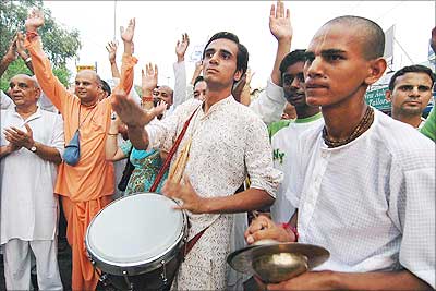 Devotees of Lord Krishna, belonging to the International Society for Krishna Consciousness, beat drums and dance in a procession a few days before Janmashtami in Amritsar.