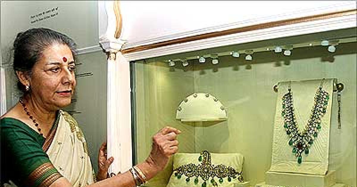 Image: Ambika Soni looks at a diamond necklace during the inauguration. The sparkling Jacob diamond, the beautiful seven stringed pearl necklace, known as 'satlada' and many glittering jewels with button pearls and diamond beads are on view.