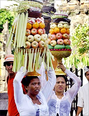 Image: Balinese women carry fruit offerings on their head at a temple in Kuta in southern Bali. Image: Bay Ismoyo/AFP/Getty Images