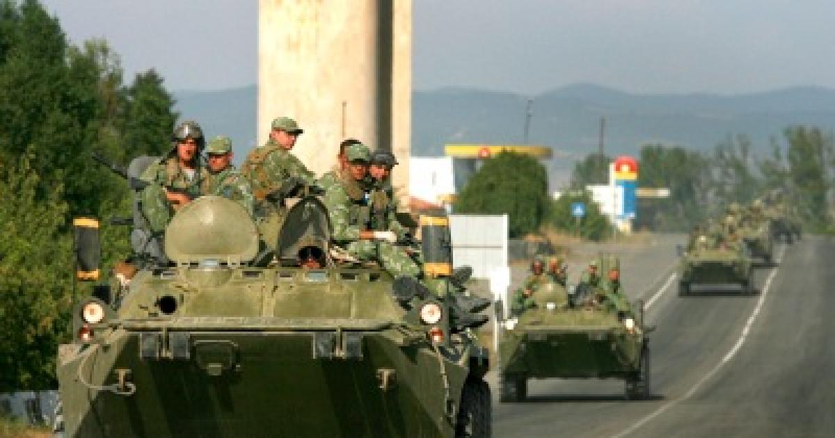 Image: Russian soldiers sit atop tanks in a column of armoured vehicles on the road from Tbilisi to Gori just outside Gori, Georgia.