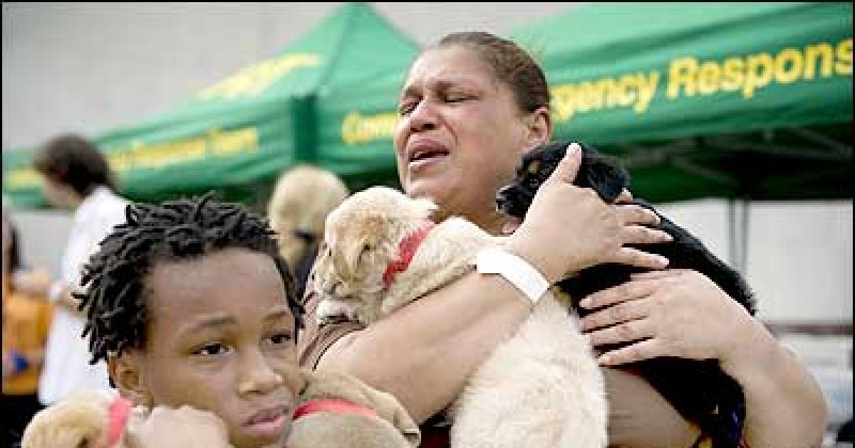 Image: Rosemarie Jarreau and her son Devontay Jenkins hug their puppies at an emercency pet evacuation center before boarding the last Amtrac train to leave New Orleans, Louisiana, en route to Memphis, Tennessee on Sunday after a mandatory evacuation was ordered ahead of Hurricane Gustav.