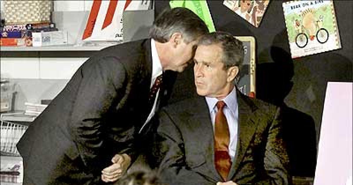 Image: White House Chief of Staff Andrew Card informs President George W Bush about a second airplane flying into New York City's World Trade Centre, while the president was reading to the children at the Emma E Booker elementary school in Sarasato, Florida, September 11, 2001.Photograph: Win McNamee JDP/Reuters