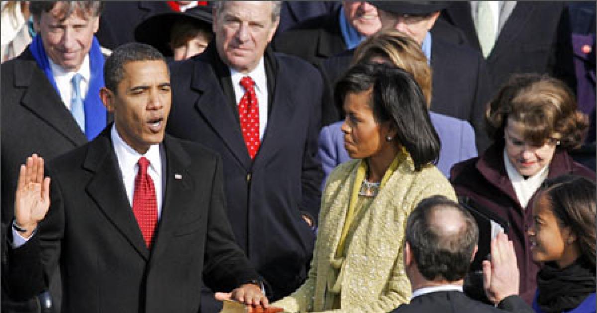 Image: Barack Obama places his left hand on the inaugural Lincoln Bible while being administered the oath of office by US Supreme Chief Justice John Roberts at the Capitol Hill. Wife Michelle and daughter Malia (R) look on.